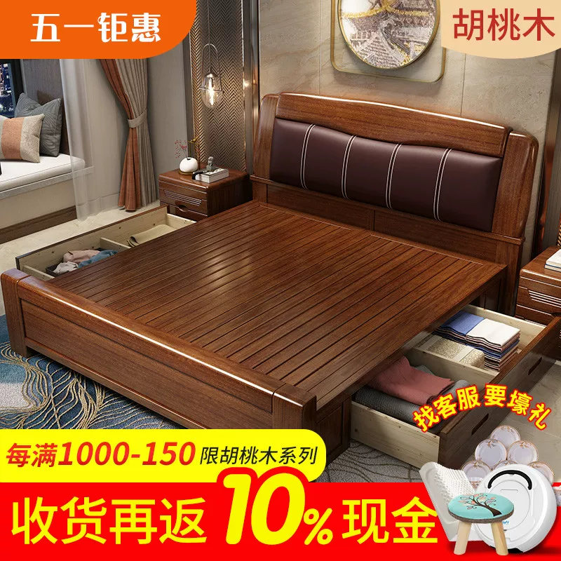 Giường gỗ óc chó nguyên khối 1,5 mét 1,8 mét mới hiện đại Trung Quốc lưu trữ hộp cao giường đôi ván gỗ nội thất - Giường