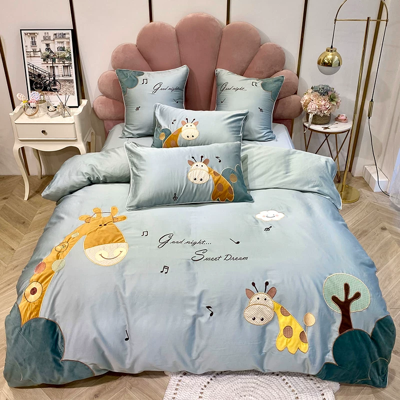 Phong cách hoạt hình 60 miếng ghim dài con hươu cao cổ bằng bông vá thêu chăn bìa bông Bộ đồ giường dễ thương nhỏ tươi mát Bộ bốn mảnh - Bộ đồ giường bốn mảnh