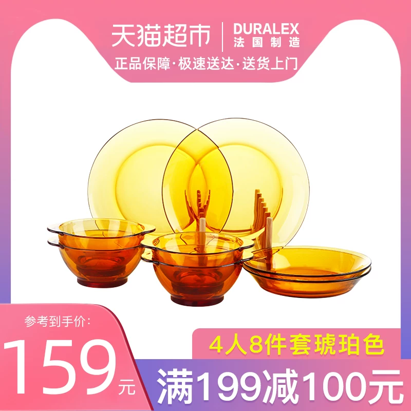 Pháp DURALEX / Doles nhập khẩu bộ đồ ăn bằng thủy tinh cường lực bốn người Bộ đồ ăn gia đình 8 miếng hổ phách - Đồ ăn tối