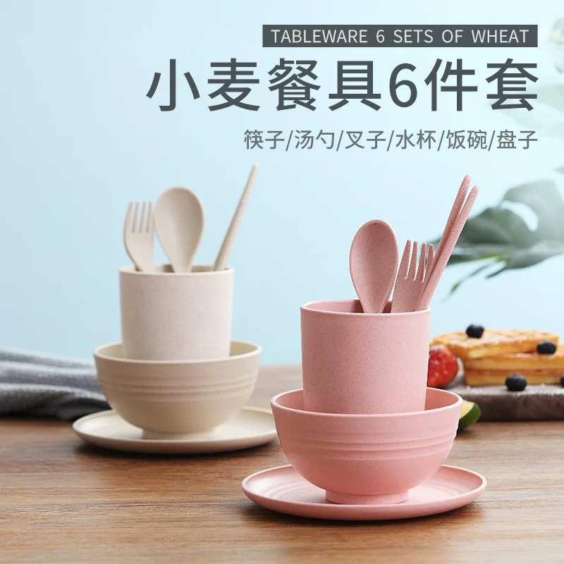 Lúa mì dao kéo bộ đồ ăn cốc sáu mảnh đặt trẻ em học sinh nhà sáng tạo nhựa bảo vệ môi trường bát đĩa dĩa muỗng đũa đặt - Đồ ăn tối