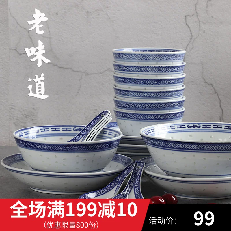 Bộ đồ ăn bằng gốm sứ truyền thống của Trung Quốc Bộ bát và món ăn tinh tế màu xanh và trắng Jingdezhen tráng men Bát cơm Bát súp Bát mỳ lớn - Đồ ăn tối