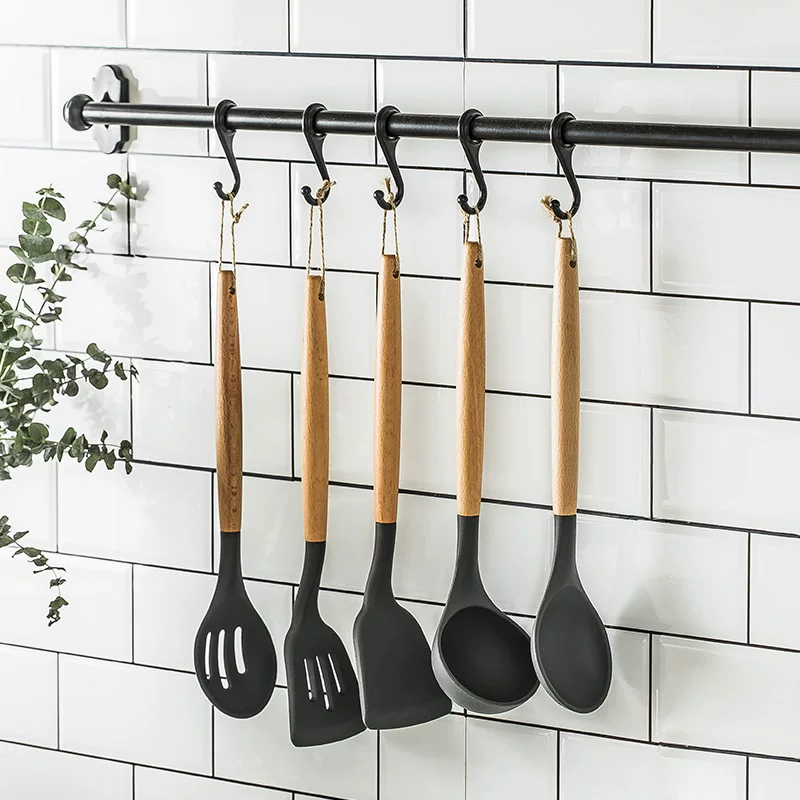 Gỗ sồi phong cách Nhật Bản xử lý không dính chảo thìa silicone dụng cụ nhà bếp sáu mảnh chịu nhiệt độ cao thìa nấu thìa thìa thìa - Phòng bếp