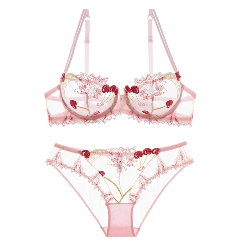 Girl Beauty House Âu Mỹ Cherry Series Bra Set Áo Ngực Thêu Siêu Mỏng Không Xốp Áo Lót Trong Suốt Áo Ngực Mùa Hè - Bộ đồ lót