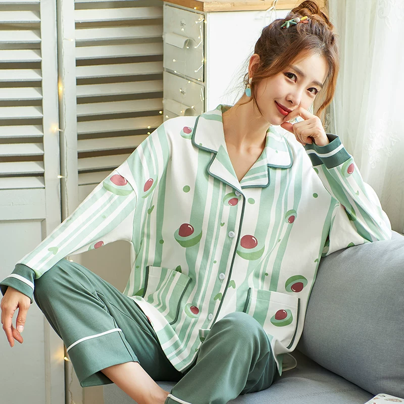 Đồ ngủ phụ nữ mùa xuân và mùa thu cotton dài tay phù hợp với Hàn Quốc giản dị dễ thương bông tươi phụ nữ mùa thu và đông dịch vụ tại nhà - Pyjama