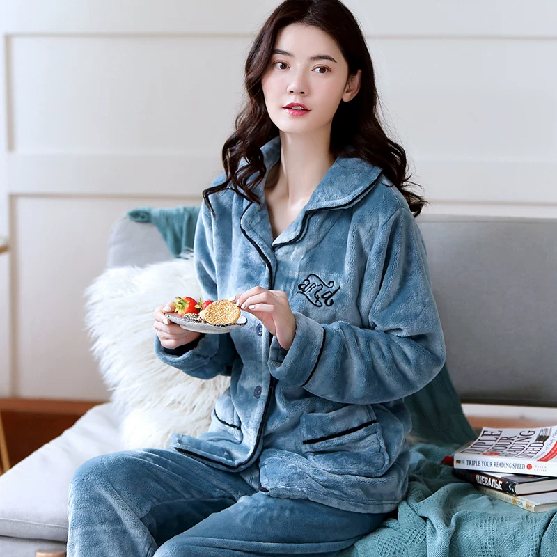 Mùa thu và mùa đông bộ đồ ngủ lông cừu san hô ngọt ngào dành cho nữ hai mảnh bộ đồ dày dặn, dài tay ấm áp chất nỉ Hàn Quốc phục vụ tại nhà - Giống cái