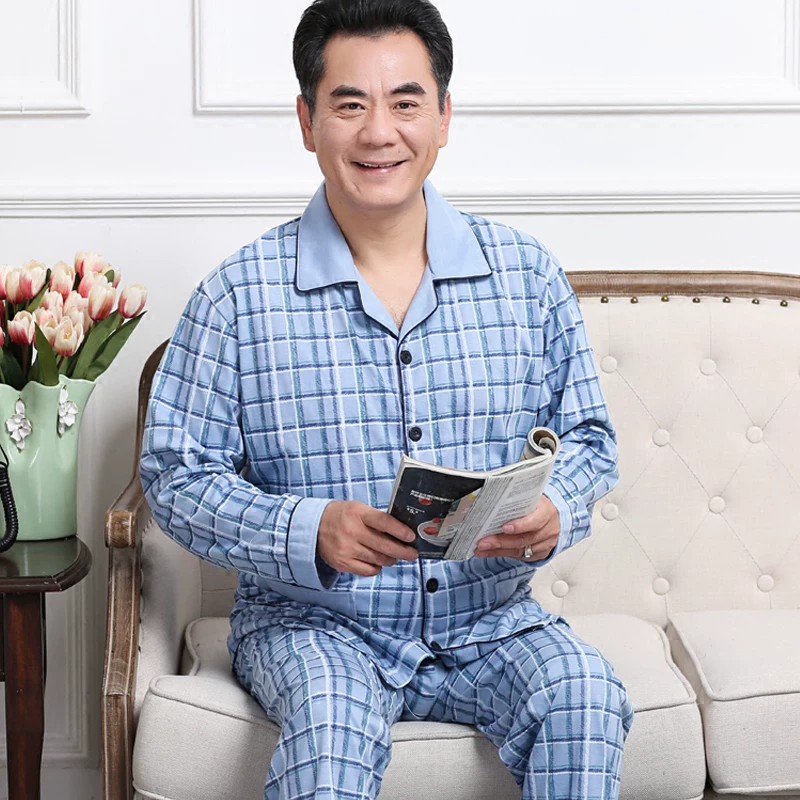 Bộ đồ ngủ nam dài tay cỡ trung niên dài tay, vải cotton phong cách mùa xuân và mùa thu cộng với bộ đồ phục vụ tại nhà dành cho nam giới phong cách béo gầy - Giống cái