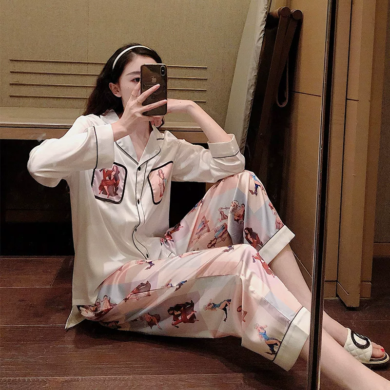 INS Queen in bộ đồ ngủ lụa nữ Xia Bingsi dài tay phù hợp với sexy mỏng lỏng lẻo hai mảnh dịch vụ tại nhà - Giống cái