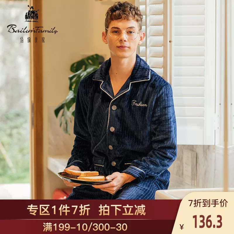 Balun gia đình mùa thu và mùa đông nam đồ ngủ nhung san hô ấm dày thanh niên cardigan flannel dịch vụ nhà phù hợp - Nam giới