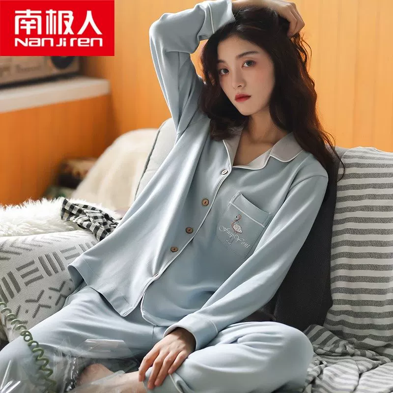 Người Nam Cực đồ ngủ phụ nữ mùa thu cotton dài tay mỏng phần mùa xuân và mùa thu dễ thương sinh viên lỏng lẻo phụ nữ trẻ phù hợp với dịch vụ nhà - Nam giới