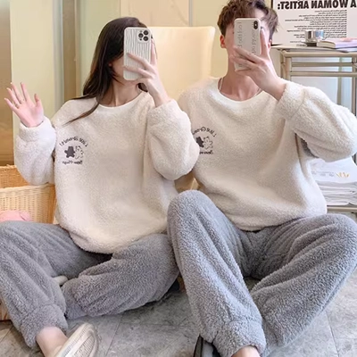 Bộ đồ ngủ dày flannel nữ mùa thu và mùa đông dài tay lông cừu san hô phù hợp với kích thước lớn nữ phiên bản Hàn Quốc - Nam giới