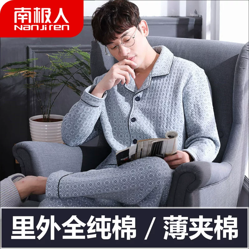 Bộ đồ ngủ nam mùa thu và mùa đông ba lớp ấm áp xen kẽ cotton dày dài tay cộng với kích thước phục vụ tại nhà Bộ đồ chần bông mỏng - Nam giới