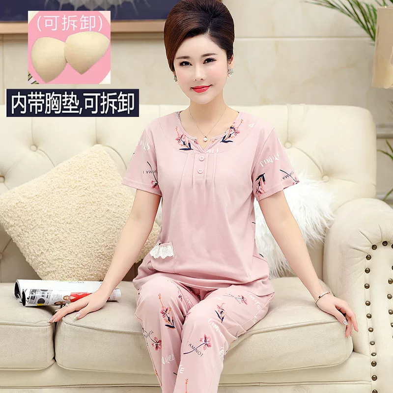 Bộ đồ ngủ cotton mùa hè ngắn tay cho người trung niên và cao tuổi phù hợp với phụ nữ có đệm ngực kèm theo size hai mảnh phục vụ tại nhà cho mẹ - Nam giới