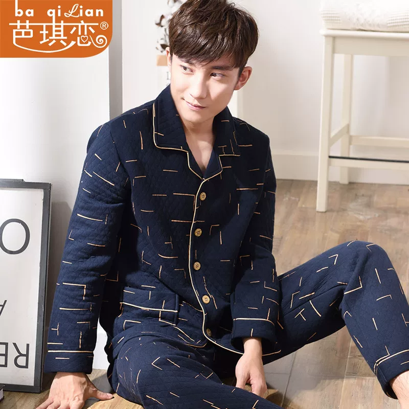 Bộ đồ ngủ nam chần bông mùa đông dày ấm áp bằng bông tinh khiết mùa xuân và mùa thu phong cách bông mỏng sandwich cộng với bộ đồ phục vụ tại nhà có kích thước - Nam giới