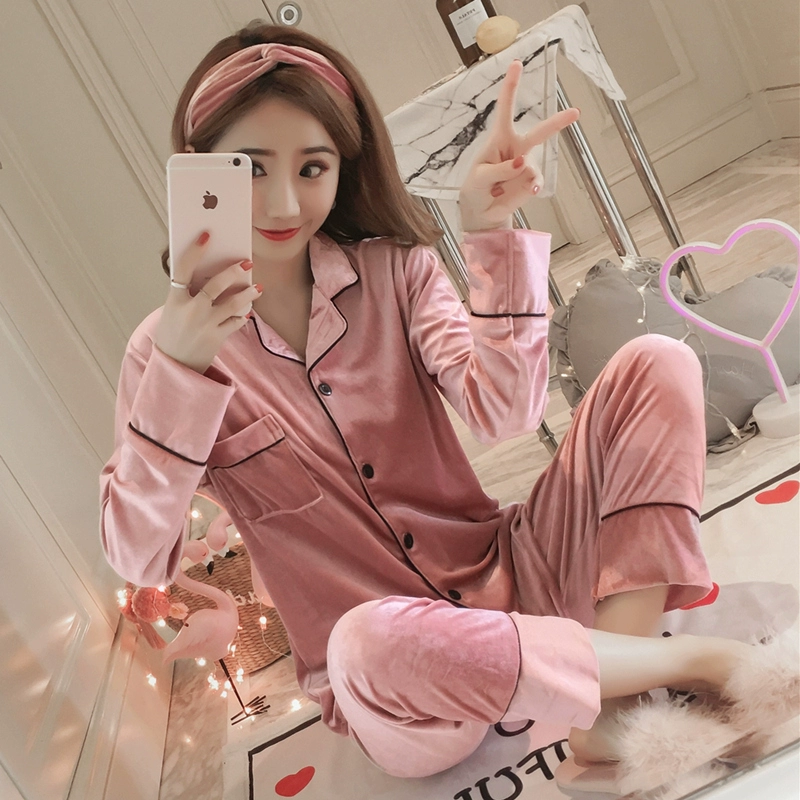 Bộ đồ ngủ nữ vàng nhung dài tay mùa xuân và mùa thu đông nhung mỏng mở nút dịch vụ nhà nhung ấm áp đầu mùa thu - Cha mẹ và con