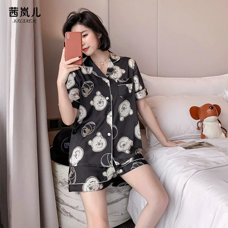 Đồ ngủ nữ mùa hè ngắn tay phần mỏng họa tiết gấu dễ thương in lụa plus size phục vụ tại nhà - Cha mẹ và con
