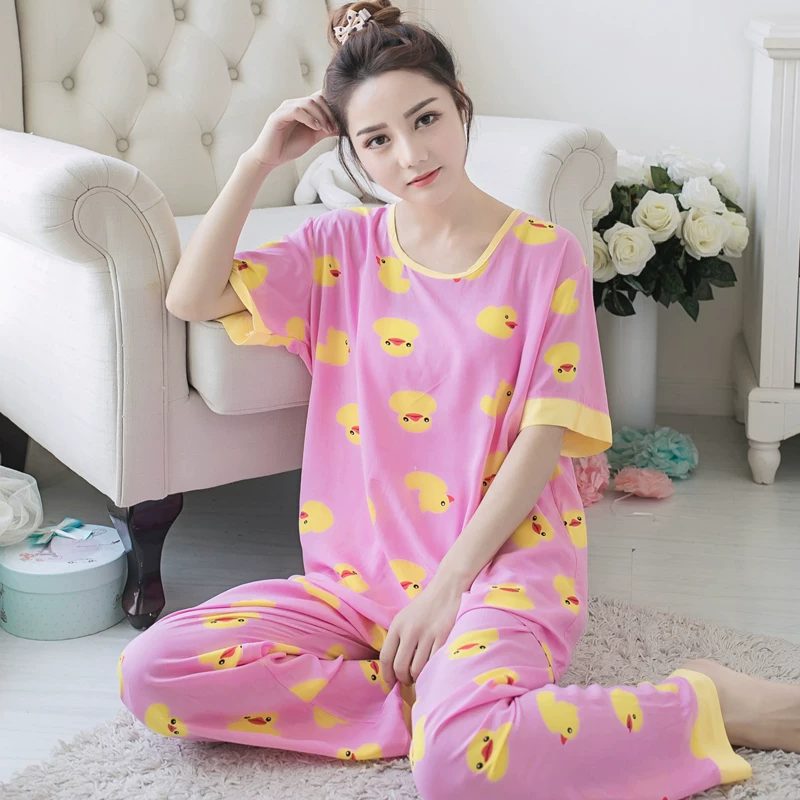 Phong cách Hàn Quốc đồ ngủ nữ mùa hè cotton ngắn tay tươi mát và dễ thương màu vàng vịt lớn phù hợp với dịch vụ ở nhà cotton lụa mỏng hai mảnh học sinh - Cha mẹ và con