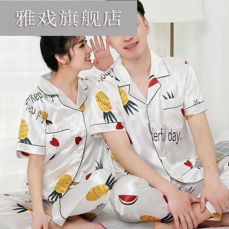 Cặp đôi đồ ngủ nữ Xia Bingsi mỏng gợi cảm mùa xuân và mùa thu ngắn tay dễ thương sinh viên lụa mùa hè dịch vụ tại nhà phù hợp với nam - Cặp đôi