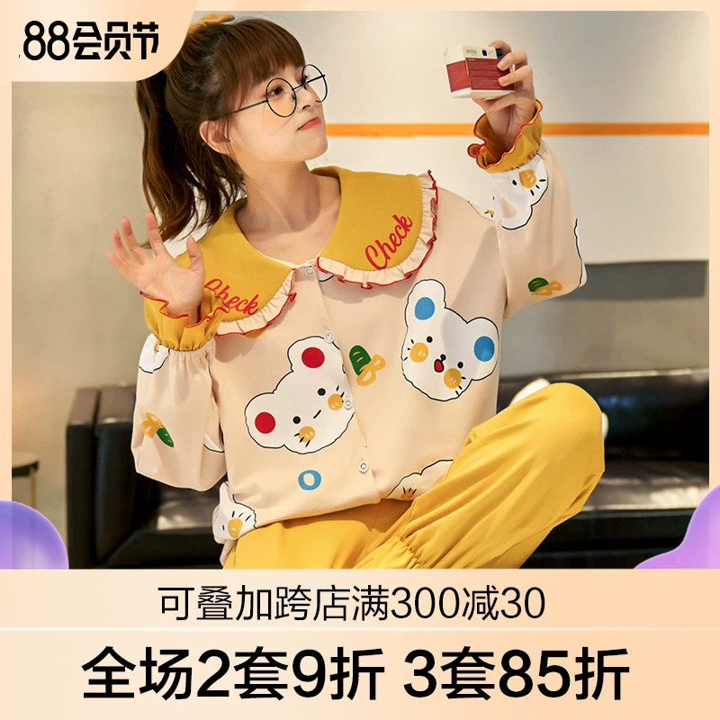 Đồ ngủ của phụ nữ mùa thu cotton tinh khiết dài tay phong cách Hàn Quốc mỏng phù hợp với mùa xuân, mùa thu và mùa đông dễ thương sinh viên lỏng lẻo giản dị dịch vụ tại nhà - Cặp đôi