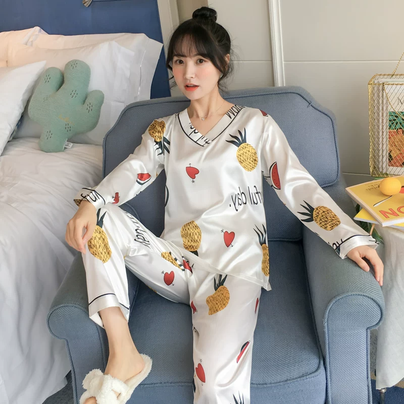 Bộ đồ ngủ nữ mùa xuân và mùa thu băng lụa dài tay mỏng cổ chữ V mùa hè in quần tây lụa thực sự phục vụ tại nhà - Cặp đôi