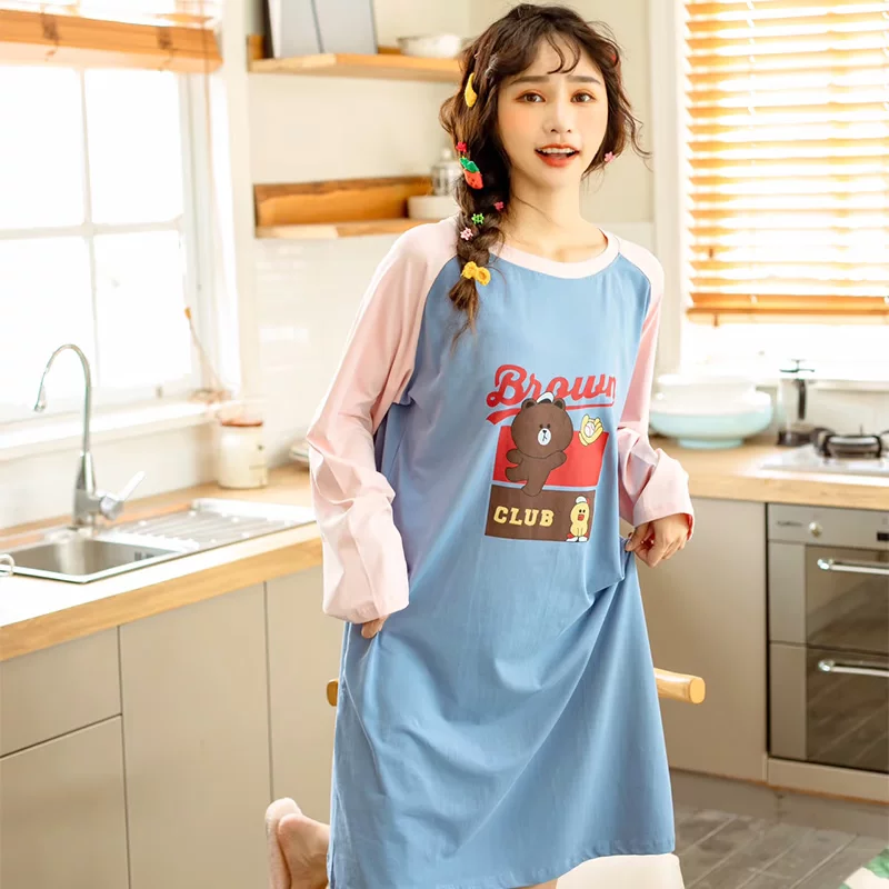 Bộ đồ ngủ nữ mùa thu Meng Yalin, váy cotton dài tay in hoạt hình, tay áo raglan, dịch vụ tại nhà cho nữ sinh - Cặp đôi