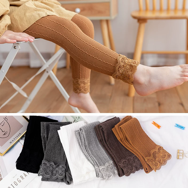 Quần legging trẻ em mùa thu mỏng phần trẻ em bé lớn trẻ em mặc ngoài quần tất cô gái cotton chín điểm ren ren - Xà cạp