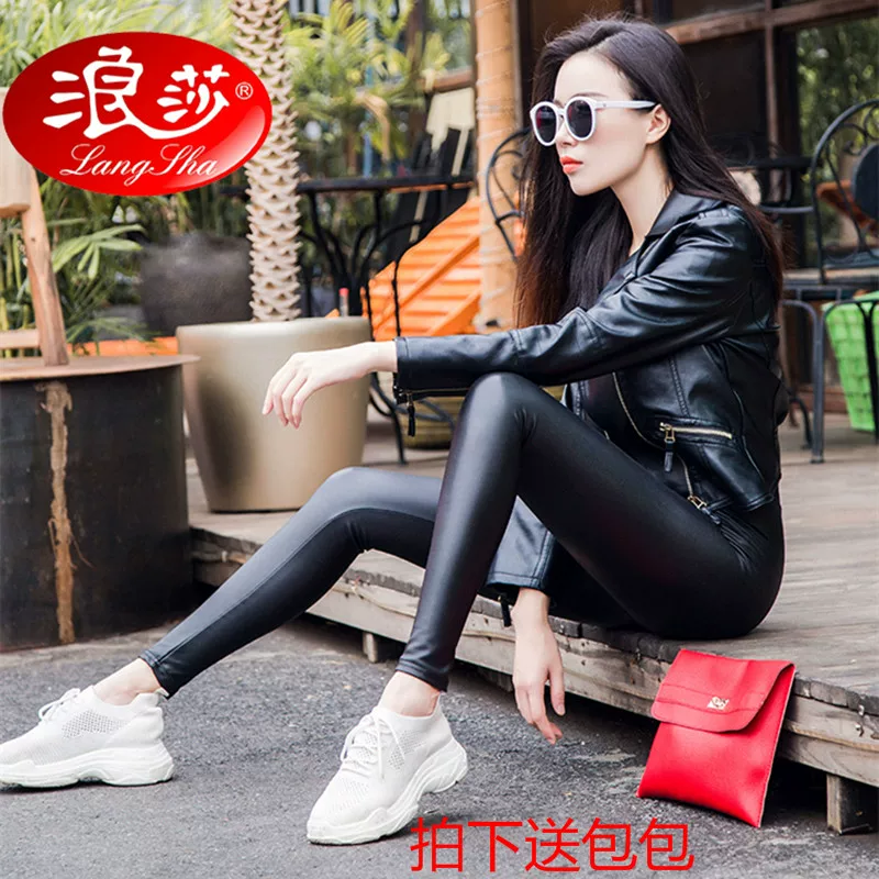 Quần da cạp cao mới của Langsha cho mùa thu đông nữ tính và mỏng, chân co giãn mặc quần bốt da mô tô đáy chín điểm - Xà cạp