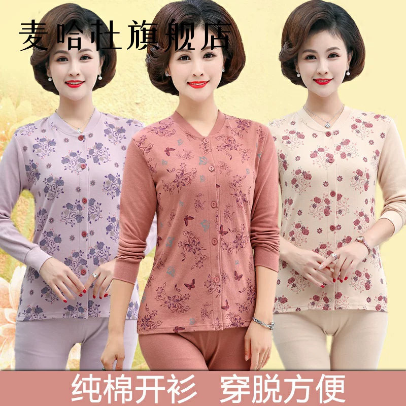 Mẹ đồ lót giữ nhiệt phù hợp với phụ nữ trung niên và cao tuổi áo len cotton tinh khiết mỏng phần bà trung niên quần áo mùa thu quần dài cotton kích thước lớn - Phù hợp với nóng lên