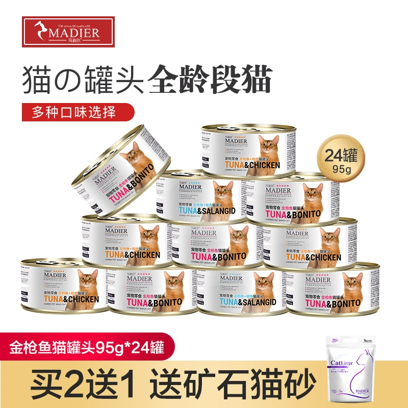 Madir cho mèo đóng hộp thực phẩm thiết yếu hộp 95g * 24 dinh dưỡng vỗ béo lông cá ngừ mang gà con mèo con thức ăn ướt đồ ăn nhẹ - Đồ ăn nhẹ cho mèo