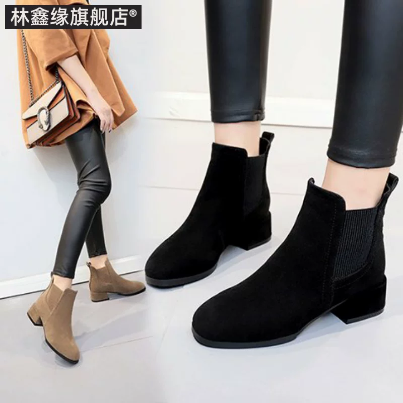 Giày bốt ngắn mũi vuông của phụ nữ 2020 mới mùa xuân và mùa thu hoang dã ins dày gót chân đàn hồi giày cao gót giữa giày Martin giày bốt mỏng - Bật lửa