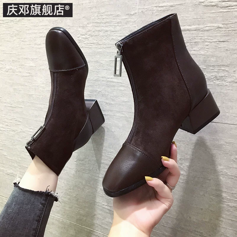 . Martin boots phụ nữ 2019 mới giày cao gót khởi động mùa thu và mùa đông giày ngắn giày bông của phụ nữ giày hoang dã của phụ nữ giày cao gót dày đơn khởi động nude - Kính khung