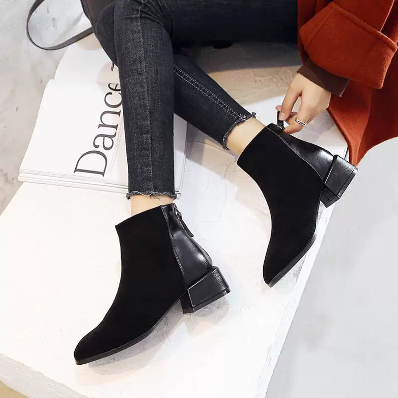 2018 mùa thu và mùa đông mới khởi động giày cao gót dày gót giày của phụ nữ mũi nhọn tất cả các trận đấu màu đen giày ống ngắn mỏng kéo dài xu hướng giày Martin - Kính đeo mắt kính
