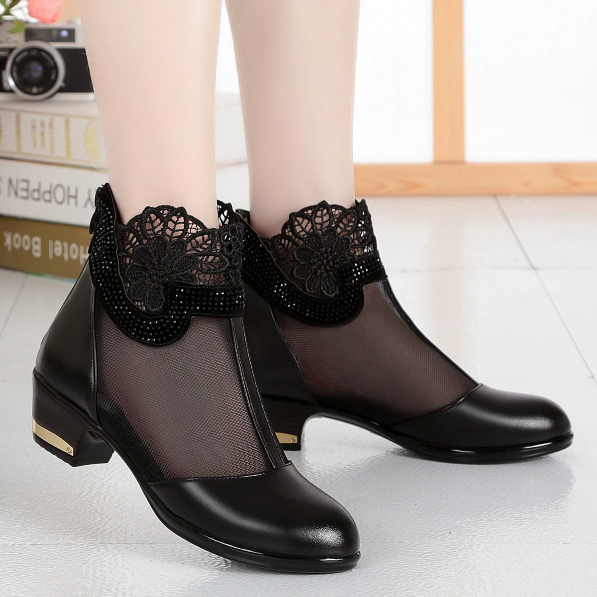 Giày bốt nữ da đế rỗng gót nhọn mũi nhọn lưới kích thước lớn xăng đan sương giá giản dị tất cả phù hợp với mùa xuân và mùa thu giày đơn - Swiss Army Knife