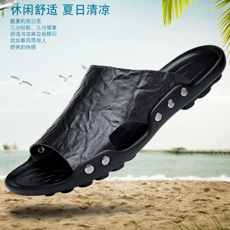 Dép da bình thường xu hướng dép nam không thấm nước bên ngoài mang giày cỡ lớn 2019 mùa hè mới phẳng đáy - Dép
