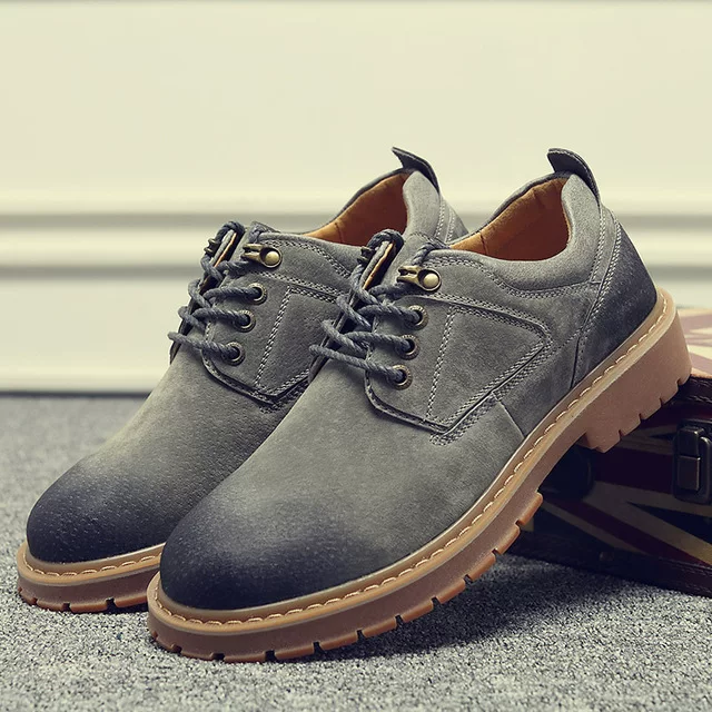 Mùa xuân và mùa thu da lớn đầu dụng cụ giày nam đất mềm đáy chống trượt sửa chữa giải trí giày da da bò thanh niên màu xám giày Martin thấp đầu - Giày thấp