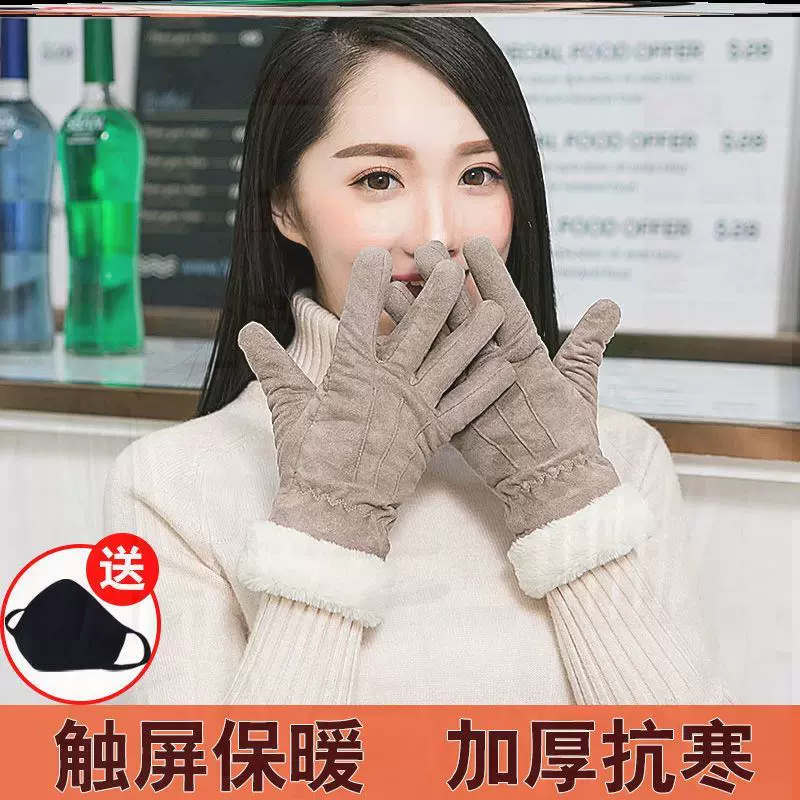 Găng tay nữ mùa đông nhung dày ấm áp sinh viên da lộn phiên bản Hàn Quốc găng tay màn hình cảm ứng dễ thương lái xe ngoài trời - Găng tay