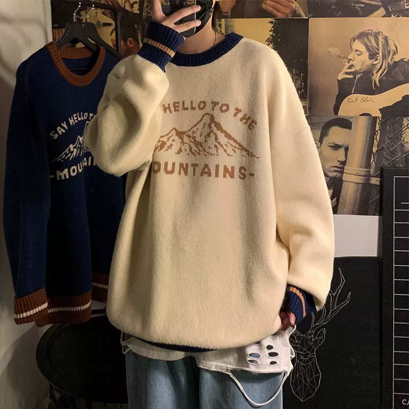 Thời trang áo len nam lỏng lười gió lót phong cách Hồng Kông áo len thu đông phong cách hàn quốc xu hướng cá tính áo khoác chui đầu - Áo len thể thao / dòng may