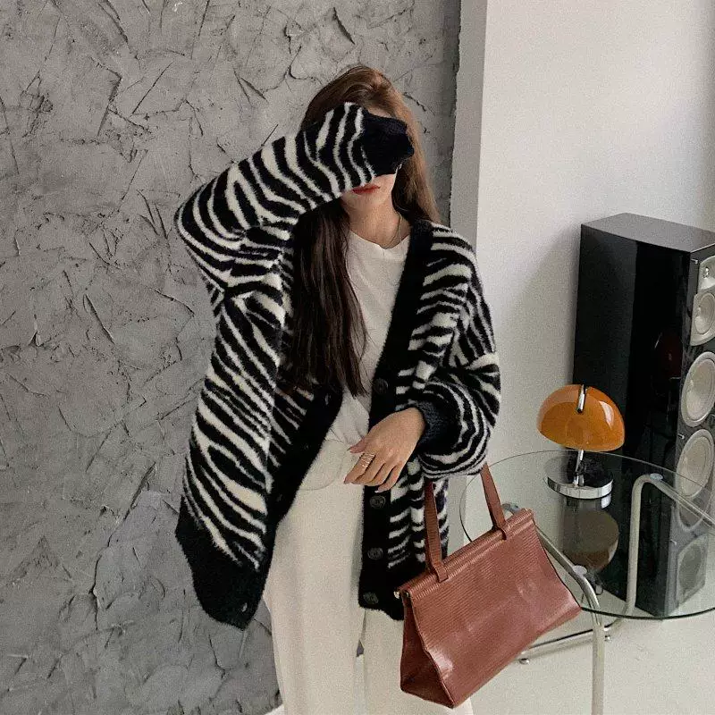 Mùa thu và mùa đông mới mẫu ngựa vằn áo len dày rộng rãi của phụ nữ cộng với kích thước béo MM lười gió và áo khoác cardigan dệt kim mỏng - Áo len thể thao / dòng may