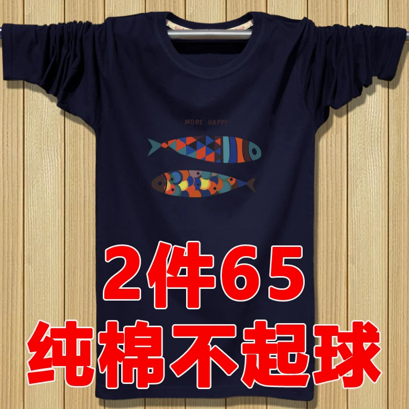 Áo thun nam mùa thu trẻ trung, áo cotton cổ tròn nguyên chất rộng rãi in size đáy, quần áo mùa thu quần áo nam - Áo phông dài