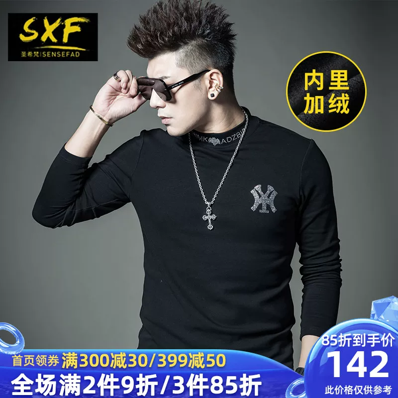 Áo phông nam châu Âu tay dài thương hiệu áo thun cộng nhung nhung 2019 thu đông nửa cổ cao cổ áo xu hướng nam xu hướng - Áo phông dài