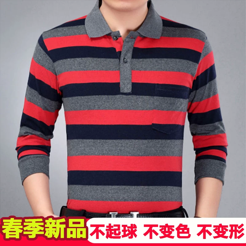 Áo thun nam tay ga mùa hè Hengyuan Hương giản dị sọc áo sơ mi nam trung niên ve áo sơ mi bán cotton - Polo