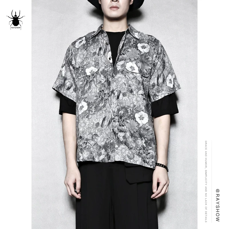 RAYSHOW Lei Xiu Hong Kong phong cách quần áo nam Anh retro hoa lớn lanh giản dị áo sơ mi ngắn tay thủy triều 5cm - Áo