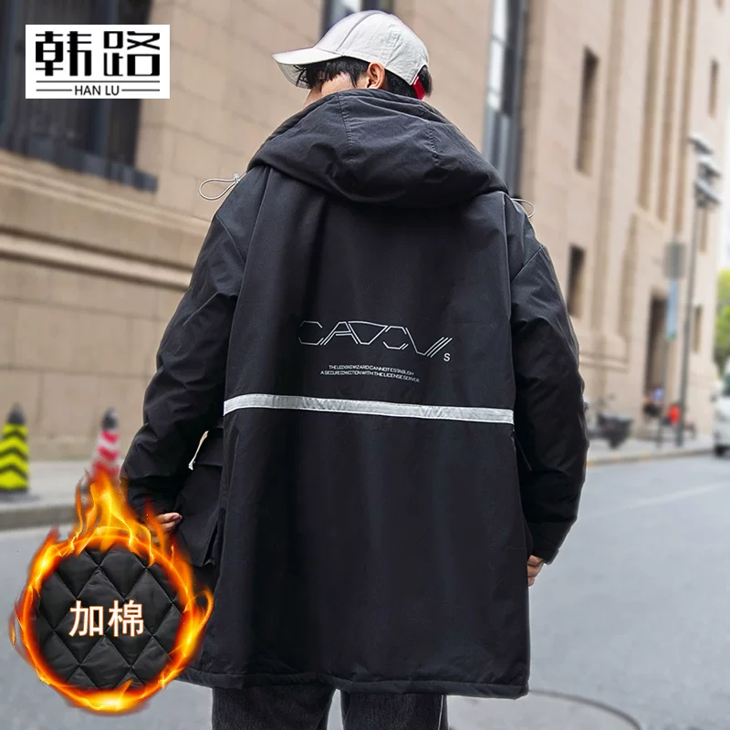 Áo hàn quốc cộng với áo gió cotton 2019 mùa đông mới trùm đầu ins dải phản quang giữa áo dài ấm áp quần áo nam giản dị - Áo gió