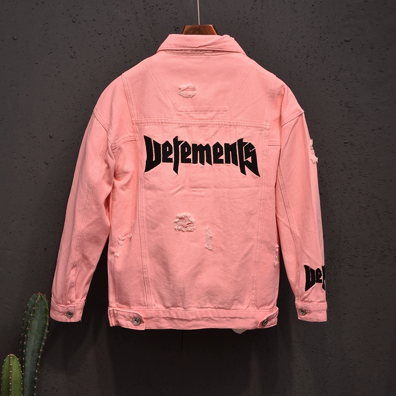 Cặp đôi châu Âu thêu denim áo khoác phiên bản Hàn Quốc của ulzzang thời trang áo khoác màu hồng thương hiệu rách top - Cực lớn