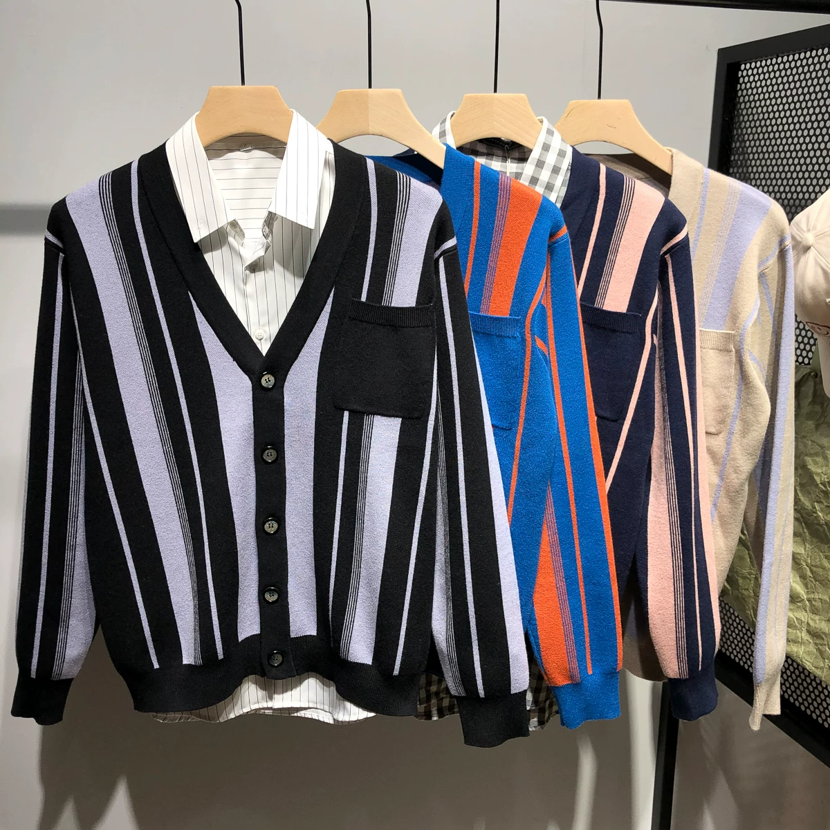 Sushe Quần áo nam sọc dọc đan áo len nam Slim Hàn Quốc Xu hướng dệt kim Áo len cá tính - Kéo qua
