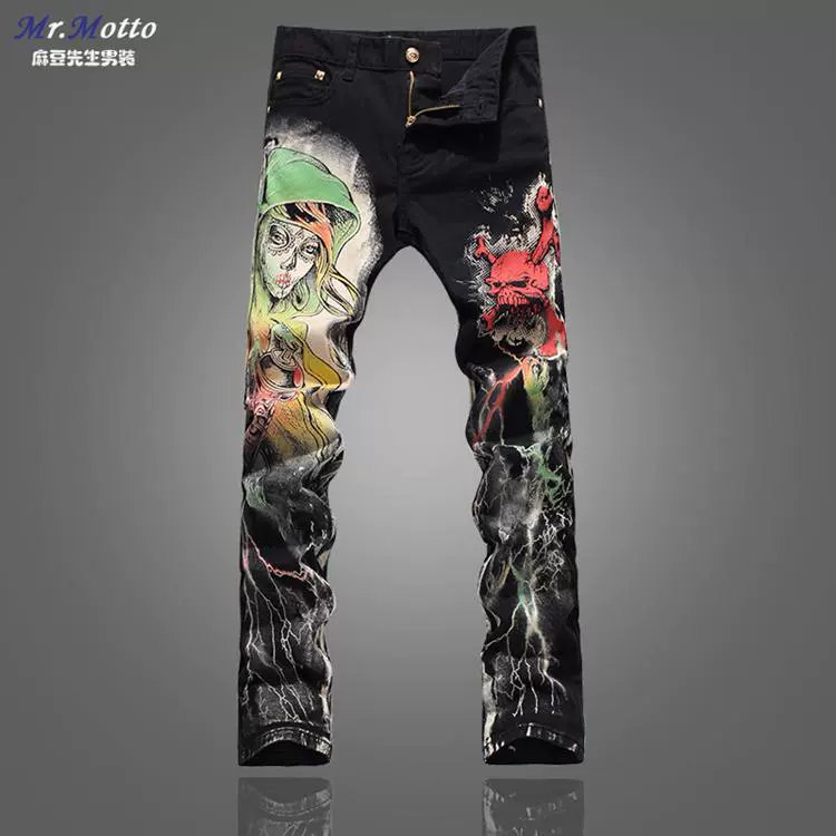 Quần nam thời thượng, in cá tính, quần jean nam, phiên bản Hàn Quốc tự tu, xu hướng hộp đêm thời trang quần nam hoa, nam - Quần jean