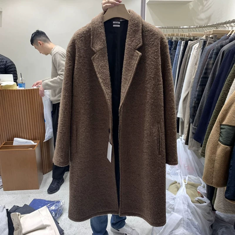 Áo khoác len lông cừu mùa đông trơn màu áo khoác len dáng dài đơn ngực giữ ấm - Áo len
