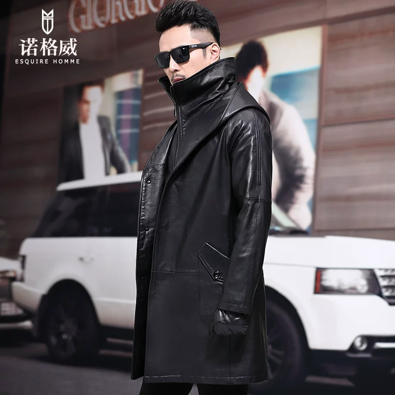Áo khoác gió da bò lớp trên có kích thước lớn có mũ trùm đầu áo khoác da trung niên dài xuống áo khoác da thường - Quần áo lông thú