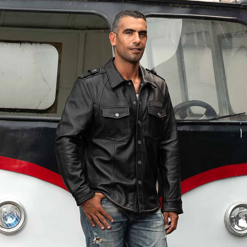 HARLEY ANGEL Harley da nam mỏng-vừa vặn lớp đầu tiên áo khoác da bò áo sơ mi da xe máy nam - Quần áo lông thú