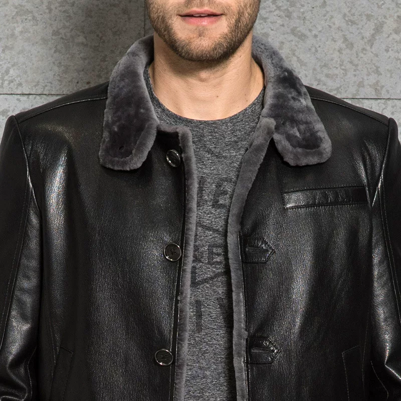 Áo khoác da nam, lớp đầu tiên da bò, đính đá và áo khoác da nam dài cỡ trung có ve lớn màu xám cũ - Quần áo lông thú