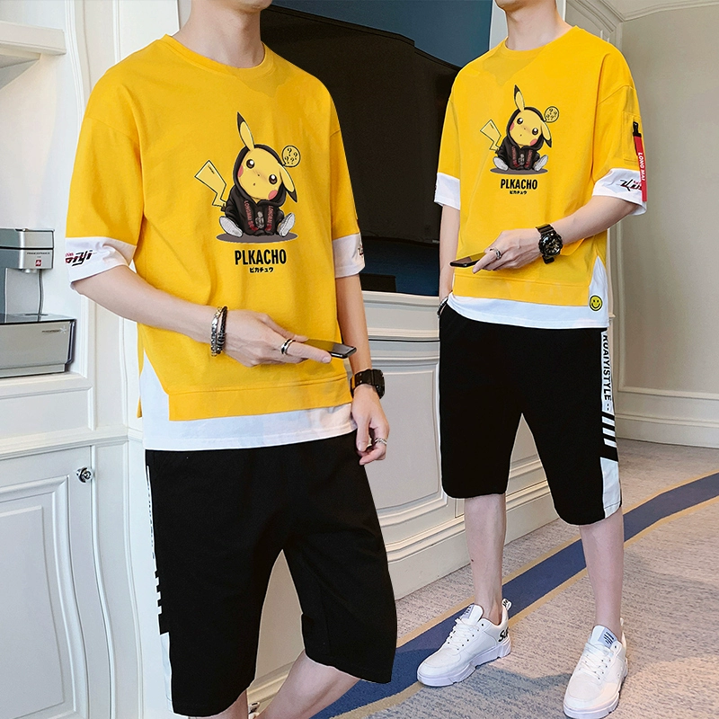 Áo thun nam ngắn tay mùa hè nam phong cách Hong Kong in cá tính nửa tay đẹp trai quần đùi thể thao hàn quốc hai mảnh - Bộ đồ